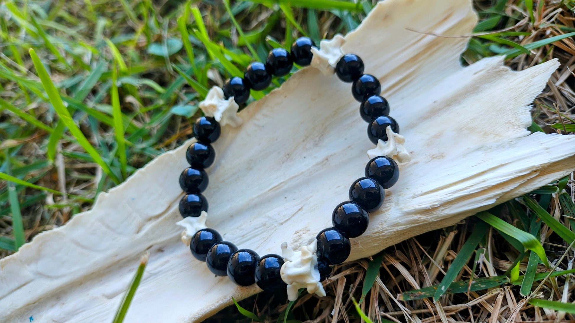 Connect with your primal instincts and embrace the raw beauty of the natural world with this captivating bracelet, a fusion of black glass and bone that exudes an earthy power and timeless elegance. This isn't just an accessory; it's a wearable reminder of your connection to the earth and the wild spirit that resides within.