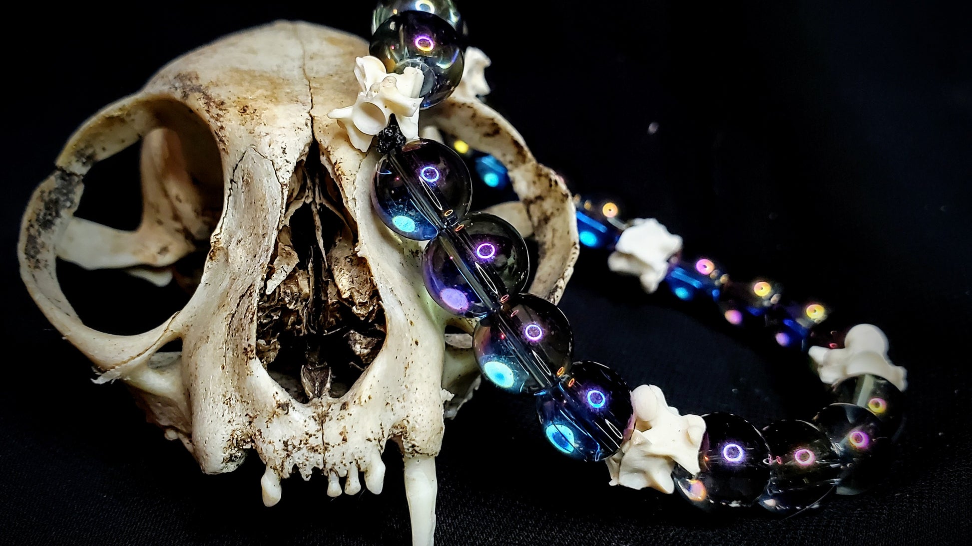Nestled between these cosmic orbs are genuine boa vertebrae, connecting the celestial to the primal. These organic accents ground the ethereal, reminding us of roots, even in the vastness.