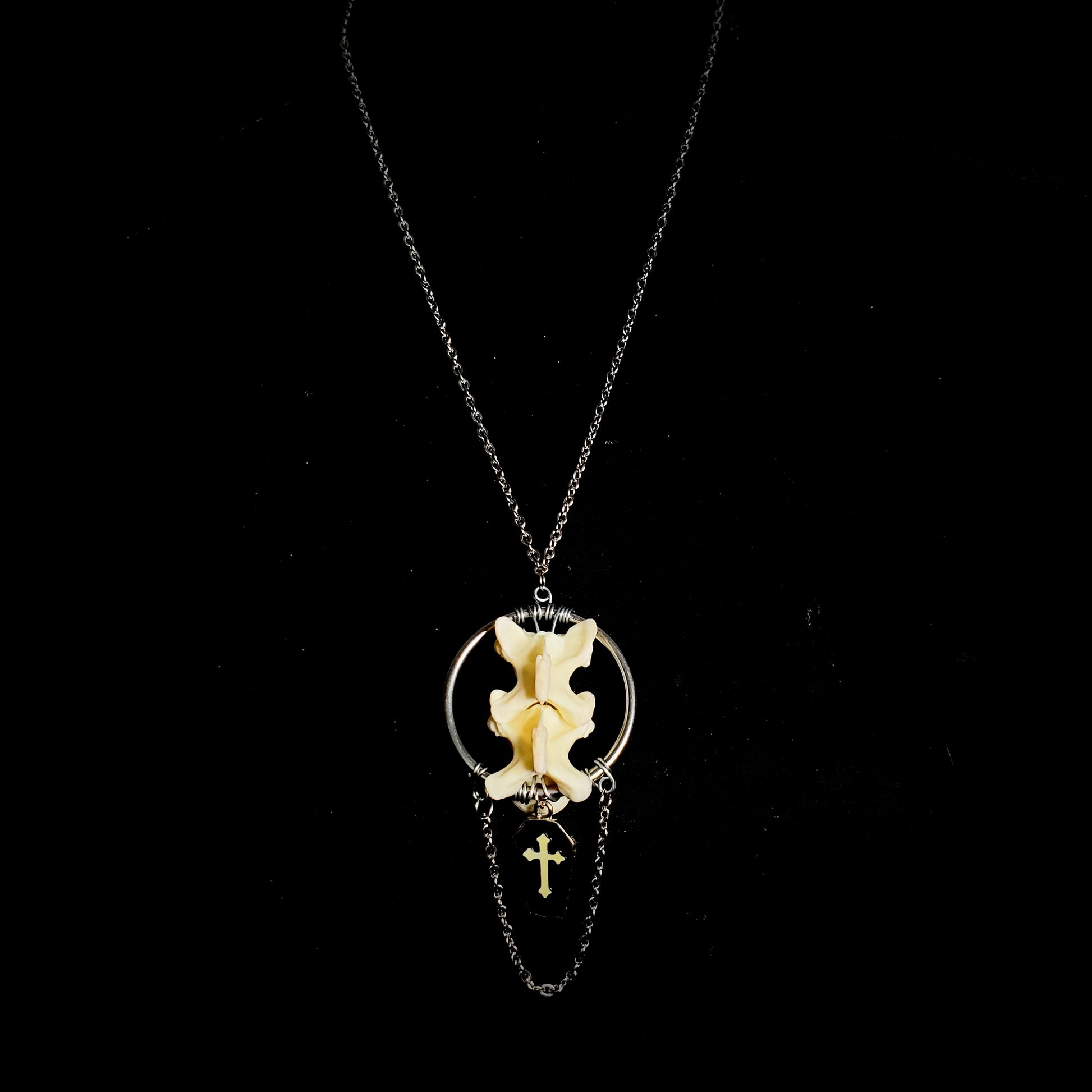 This pendant features a real monitor lizard vertebra secured with silver wire-wrapping to highlight its unique shape. A small black enamel coffin charm dangles from the base, adding a gothic touch to the organic bone texture.