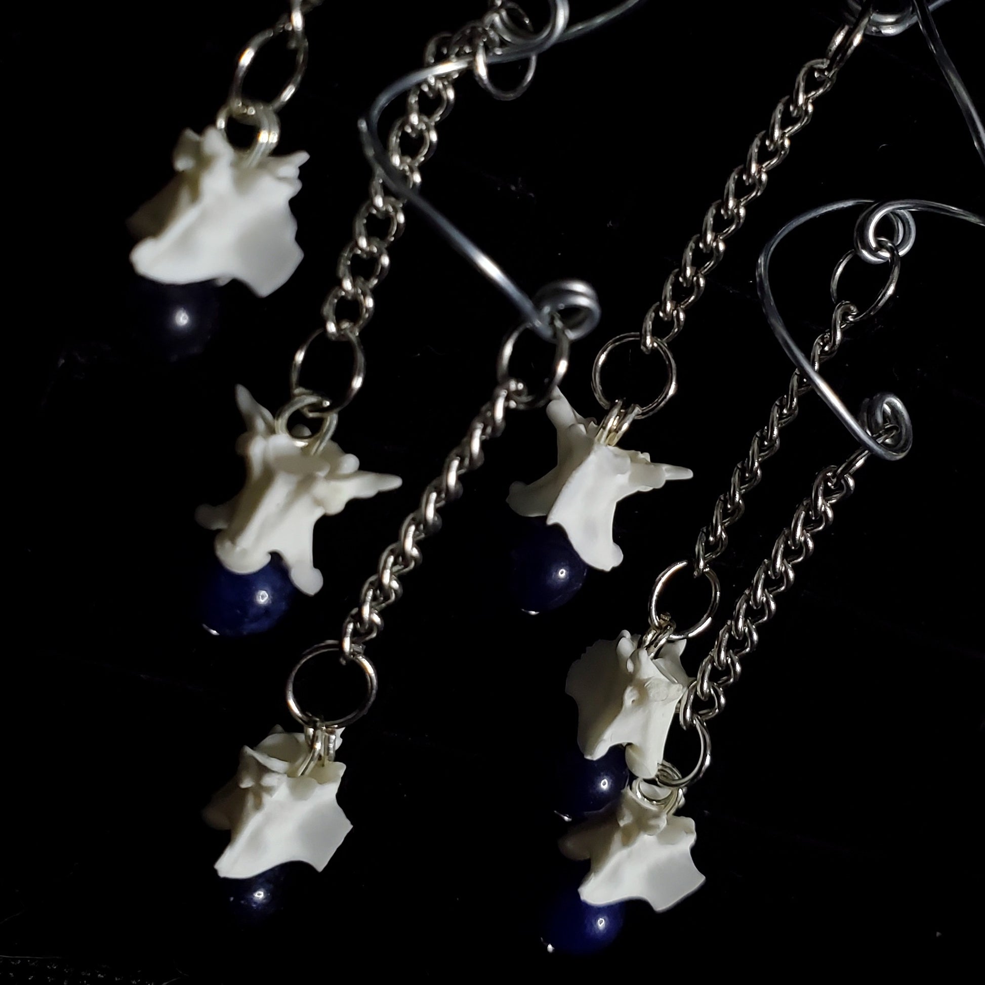 These unique earrings feature authentic rattlesnake vertebrae paired with deep, dyed blue jade beads that dangle from delicate silver chains. Suspended from custom-shaped silver wire spirals, the tiered design creates a beautiful sense of flow and rhythm. Lightweight and finished with classic fish-hook wires, they are an elegant, earthy statement piece for any collection.