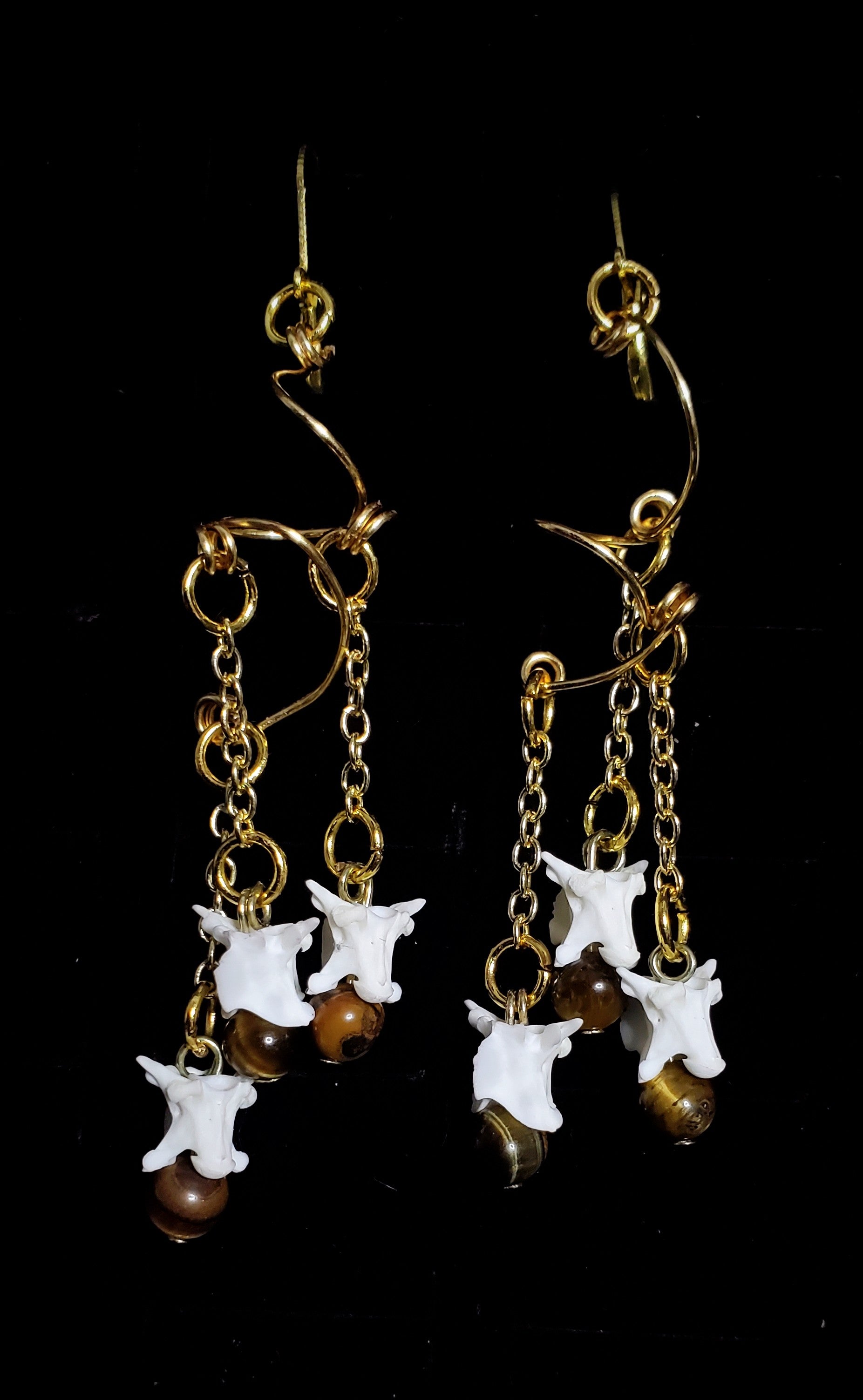 Bring a touch of warmth and movement to your collection with these intricate tiered earrings. Featuring authentic rattlesnake vertebrae and rich, golden-brown Tiger’s Eye beads, these pieces combine organic textures with protective energy. The elements cascade from hand-formed gold-tone wire spirals on delicate chains, creating a graceful, rhythmic flow as you move. Lightweight and finished with matching gold-tone fish-hook wires, they are a perfect statement for those who walk between the earthy and the celestial.