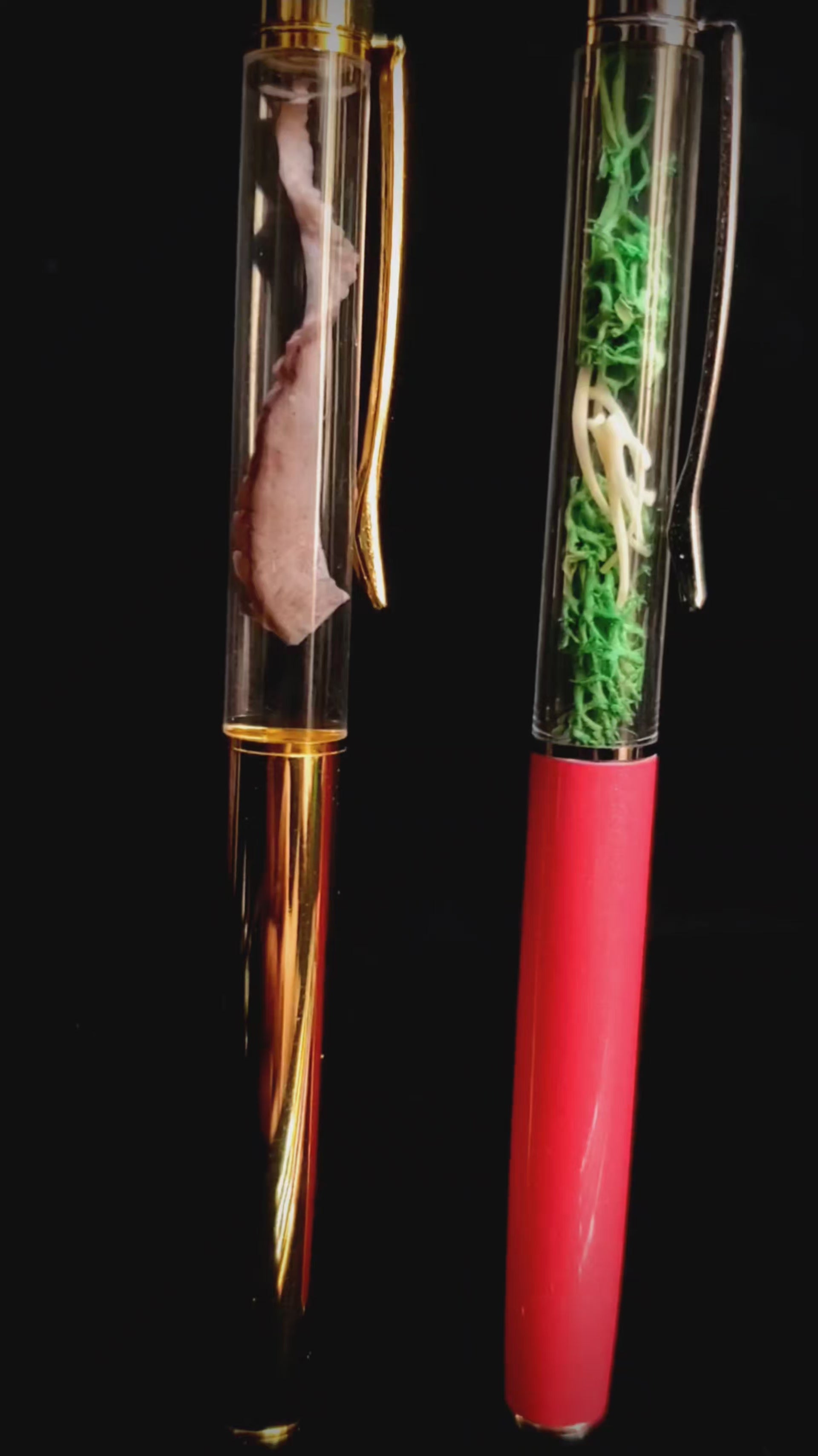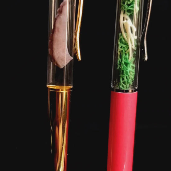 Encased in a clear, solid chamber, the dry specimens offer a sense of ancient permanence and natural wonder. Select pens featuring vibrant, lifelike moss for a touch of botanical intrigue and intriguing arrangements of small bones for a bold aesthetic.